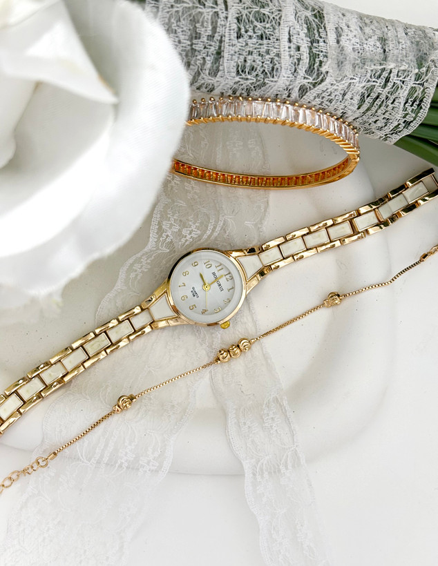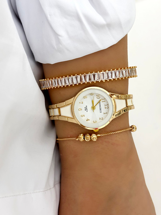 ساعت هانگری بند سرامیکی طلایی سفید زنانه✨