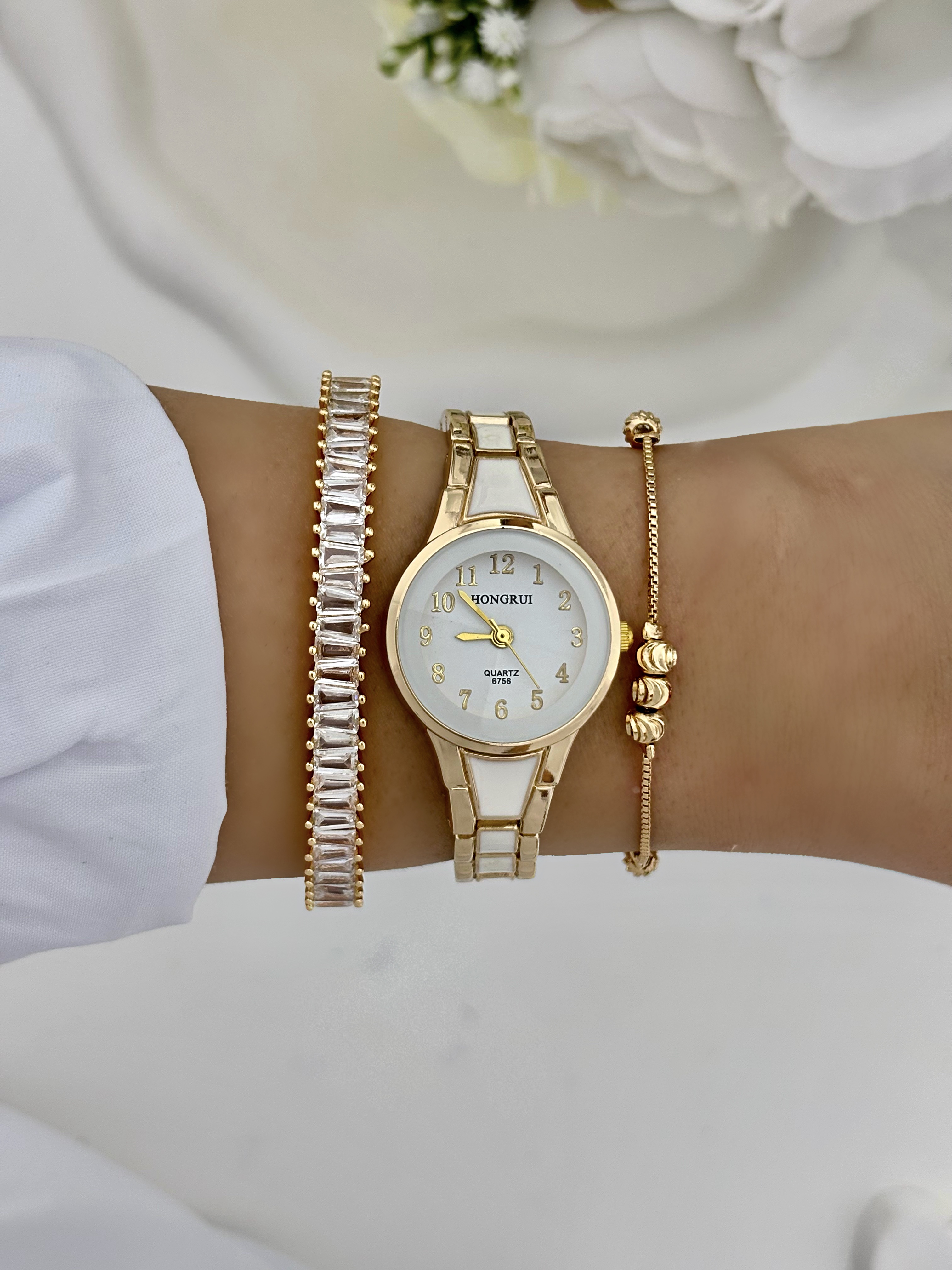 ساعت هانگری بند سرامیکی طلایی سفید زنانه✨